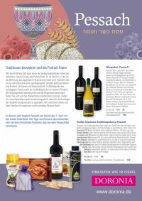 Koscher für Pessach An Pessach sind die Speisegebote strenger als im übrigen Jahr. Daher sind viele Vorbereitungen nötig, will man das Fest der Tradition entsprechend feiern. Die Koscher-Vorschriften beziehen sich vor allem auf Lebensmittel und finden bei unseren kulinarischen Grüßen aus Israel selbstverständlich Beachtung. Mini-Mazzen. Verpackt in zwei getrenn ten Portionen zu je 100 g. Neutral im Geschmack, gut ge - eignet für kleinere Haushalte und für unterwegs. Nur aus Weizen mehl und Wasser hergestellt. 200 g Art.-Nr. 08 – 1030 3,65 Fertigmischung für Mazzenknödel. Zur raschen Herstellung der beliebten Suppen - einlage, die unbedingt zu Pessach gehört. Für ca. 30 Klößchen. 142 g (Zugabe von 4 Eiern erforderlich). Ab März 2026 erhältlich. Art.-Nr. 08 – 9595 3,95 Würzige Consommé – klare Brühe mit Hühnergeschmack in der praktischen Vorratsdose. Für die Zubereitung von vegetarischen Brühen und zum Würzen von vielen Speisen sehr geeignet. Spar sam zu dosieren. Dose mit 400 g Inhalt. Ab März 2026 erhältlich. Art.-Nr. 08 – 8461 7,95 Native Olivenöl extra mit der englischen Bezeichnung „extra virgin“. So wird die höchste Güteklasse für Olivenöl bezeichnet, das rein mechanisch und kalt gepresst wird und einen Säuregehalt von maximal 0,8 % aufweist. Das Öl wurde in Spanien produ - ziert und im Kibbuz Javne abgefüllt und von dort exportiert. Es ist als koscher für das ganze Jahr, also auch für Pessach, zertifi - ziert. Glasflasche mit 750 ml Art.-Nr. 06 – 1905 22,95 Natives Olivenöl extra aus Israel. Es stammt von Ölbäumen am Berg Tabor und wird aus der Oliven sorte Souri gepresst. Ein ganz besonderes mildes, feinfruchtiges Öl, das aus der ersten Kalt - pressung stammt und mit einem Säuregehalt von nur 0,3 % ganz besonders wertvoll ist. In der licht - geschützten Aromadose. 08 – 1901 250 ml 10,95 Traditionelle Mazzen, in der 450-g- Packung. Nur aus Weizenmehl und Wasser hergestellt. Art.-Nr. 08 – 1010 5,50 Großpackung mit Mazzen aus der Traditionsbäckerei Aviv mit 120-jähriger Erfahrung. Im günstigen Kilo-Paket für die große Familie. Die Mazzen wurden nur aus Weizenmehl und Wasser her - gestellt. 1 Kg Art.-Nr. 08 – 1020 9,50 Mazzenmehl, kann wie Semmel brösel zur Herstellung von Knödeln, aber auch von Kuchen etc. verwendet werden. Es wird aus zerriebenen Mazzen gewonnen und ist fester Bestandteil der jüdischen Küche, besonders an Pessach. 454 g Art.-Nr. 08 – 1011 4,95 Rührkuchen mit Schokostückchen, ein klassisches Rezept, das der ganzen Familie schmeckt. Glutenfrei, von Osem. 250 g Art.-Nr. 08 – 3818 6,95 Marmorkuchen von Osem, glutenfrei und wie hausgemacht. Ein Festtags - kuchen, der auch den Alltag verschönt. 250 g Art.-Nr. 08 – 3819 6,95 Mini-Mazzen mit Schokoladen - überzug – eine Leckerei, die besonders zu Pessach Anklang findet. 200 g Art.-Nr. 08 – 1040 7,50 Charosset auf Dattel - basis, das mit großer Sorgfalt aus Äpfeln, Nüssen und Gewürzen hergestellt wird. Die wohlschmeckende Paste gehört zu den jüdischen Traditionsspreisen und soll u.a. an das Verfertigen von Tonziegeln in der ägyptischen Sklaaverei erinnern. Ein traditioneller Genuss – nicht nur für den Sederabend. Glas mit 250 g Art.-Nr. 08 – 1420 5,90 Dattelsirup, auch Dattel - honig oder Silan genannt, ist ein reines Naturprodukt aus Israel, einem Paradies für Dattelliebhaber. Dieser Dattelsirup besteht aus 100 Prozent Datteln. Er stammt aus der Imkerei Ein Harod, die vor über 100 Jahren im Kibbuz Ein Harod gegründet wurde. Der Dattelsirup ist geeignet zum Backen, zum Kochen und für Süßspeisen. Lecker auch aufs Brot, zu Pfannkuchen, Waffeln, in Joghurt und Quarkspeisen. Ohne Zusatzstoffe. Inhalt 350 g Art.-Nr. 08 – 9409 7,50 „Gefilte Fish“ Glas mit sanft gegar - ten Fisch-Klopsen, die zu den Hohen Feier - tagen unbedingt dazu - ge hören. Ohne Konser vie rungs- und Zusatz stoffe, gluten - frei. Glas mit sechs Portionen, Inhalt 560 g im traditio nellen polni schen Stil Art.-Nr. 08 – 1903 11,25 im würzigen ungarischen Stil Art.-Nr. 08 – 9586 11,25 Kiddusch-Wein – 7th Day aus der renommierten Kellerei Barkan. Ein lieblicher, roter Kiddusch- Wein aus der Carignan- Traube. Sie können den körperreichen Wein mit seiner sanften Erdbeer - note auch wunderbar als Dessertwein genießen. Er stammt aus den judäi - schen Hügeln und ist genau richtig zur Seder - feier und für alle anderen festlichen Anlässe. 9,5 % Vol. Art.-Nr. 06 – 6261 11,50 Kleine Haggada Hebräisch und deutsch mit allen Pessachvorschriften und zahl reichen Erläuterungen zum Fest. Mit hübschen Farbillustrationen, 19 x 13 cm, 64 S. Art.-Nr. 01 – 0319 8,90 Pessach – die Gesetze und ihre Bedeutung. Eine Einführung zu Pessach, in der Gesetze und Gebräuche erklärt werden. Eine Neuauflage des von Rabbiner Bernhard Salomon Jacobson (1901–1972) verfassten Leitfadens. Geb., 47 S. Art.-Nr. 01 – 8286 9,95 C D „Pessach ba“ Ein Schatz mit 17 hebräischen Liedern für Pessach, die meist auf traditionellen Melodien basieren. Zum Mitsingen und Anhören und zur Vorbereitung auf das Fest für die ganze Familie. CD 03 – 9403 15,- C D Meisterwerke der Synagogal - musik Mit 13 hebräischen Gebets gesängen, darunter drei Lieder für Pessach, u. a. „Kiddusch schel Pessach“, „Ma nishtana“. Mit Ober kantor Estrongo Nachama und dem Rias-Kammerchor. CD 03 – 5129 17,50 K i n d e r b u c h Kiddusch-Wein „Noblesse“ Der süße, rote Kiddusch- Wein mit dem Aroma von Gewürznelken, Rosinen und Trockenfrüchten wird auf traditionelle Art gekel - tert. Die Gärung erfolgt in Stahl tanks, die Reifung in Eichenfässern, was dem einzigartigen Wein seine dunkle Farbe verleiht. 10,5 % Vol. Art.-Nr. 06 – 6407 11,95 Chaos zu Pessach In Benis Familie herrscht mal wieder ein ziemliches Chaos: Pessach steht vor der Tür und die Kinderzimmer sind nicht aufgeräumt, das Essen nicht fertig gekocht, der Tisch nicht gedeckt, aber die Familie im Anmarsch. Bis es 