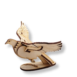 Das bereits fertiggestellte Bastelset, das eine Taube im Flug zeigt, ist aus naturbelassenem Holz gefertigt. Die Taube kommt in der Bibel rund 50 mal vor, am bedeutendsten ist wohl die Geschichte von Noah, der nach der Sintflut eine Taube ausschickte, die mit einem Ölzweig im Schnabel zurückkam. – Das Holz, das mit Laser bearbeitet wurde, wird durch Steckverbindungen zusammengehalten, ganz ohne Klebstoff. Fertiges Modell: 20 cm x 32 cm x 15 cm